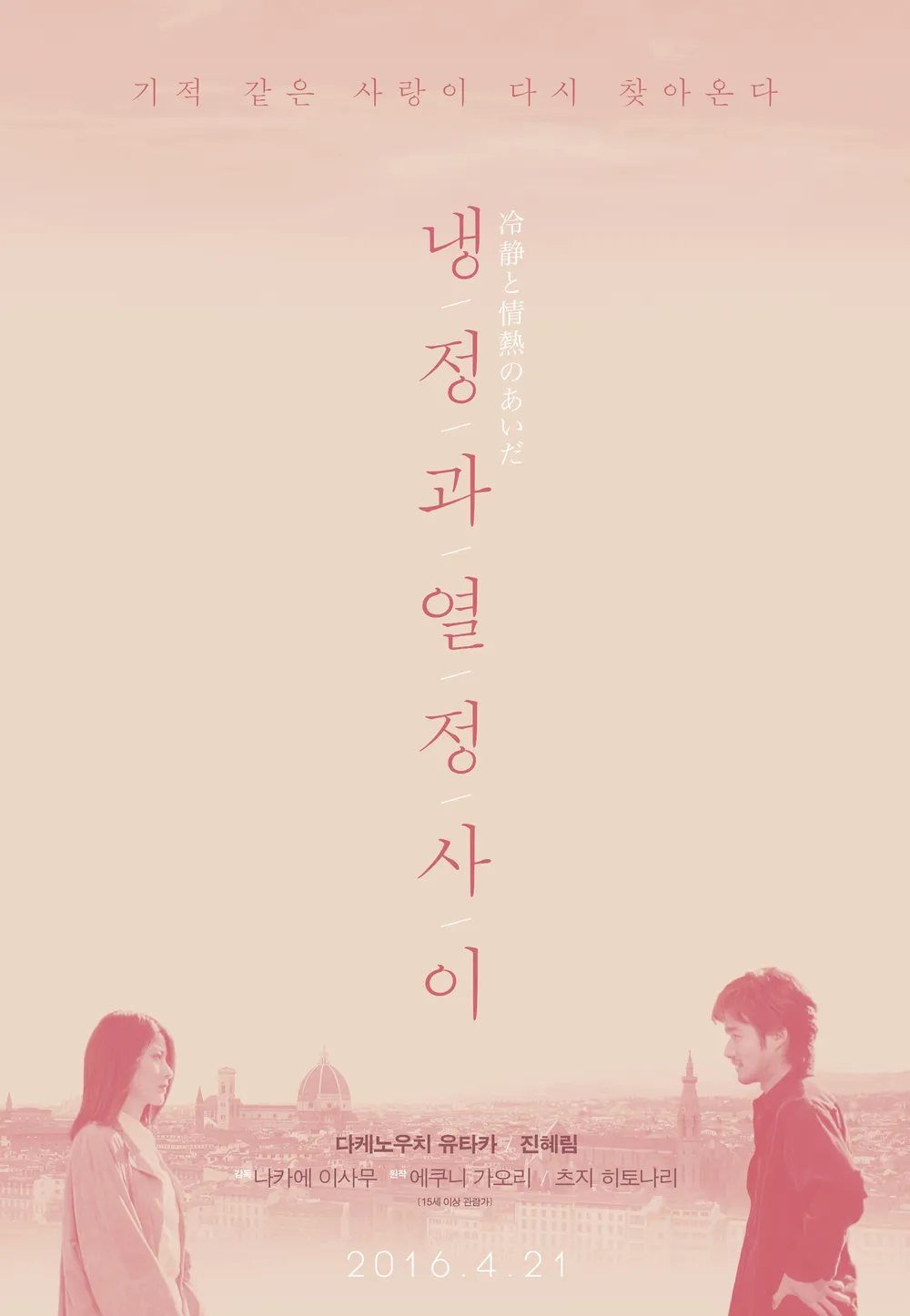 냉정과 열정 사이(冷静と情熱のあいだ, 2001)는 일본 작가 에쿠니 가오리와 츠지 히토나리의 동명 베스트셀러 소설을 원작으로 한 영화다. 원작 소설은 독특하게도 남성과 여성 두 작가가 각각의 시점에서 이야기를 풀어낸 것이 특징으로, 남성의 시선과 여성의 시선을 교차하며 사랑의 복잡한 감정을 묘사했다. 이러한 원작의 구조는 영화에서도 반영되어, 남녀 주인공의 감정선을 섬세하게 표현하는 데 큰 역할을 했다.